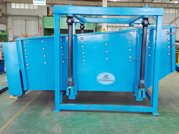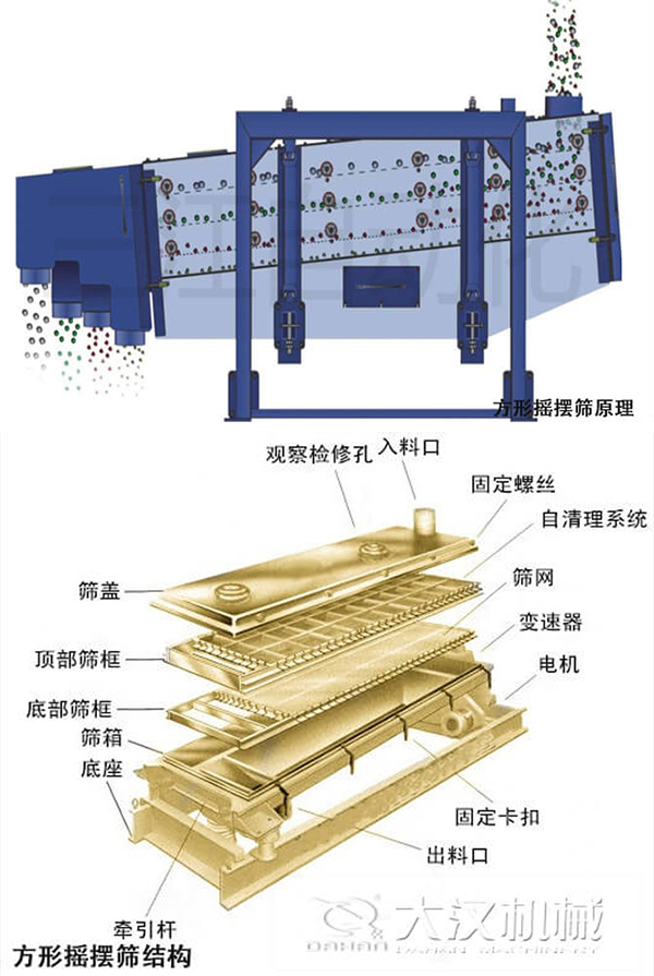 方形搖擺篩的主要結(jié)構(gòu)有:傳動裝置,布料器,篩箱,支撐架,驅(qū)動裝置等。