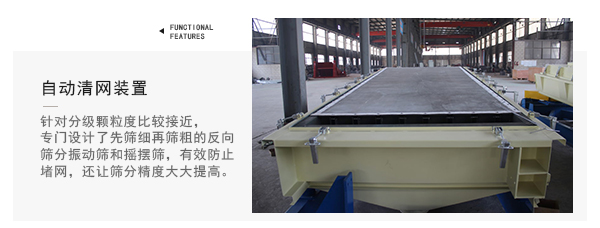 ★自動清網(wǎng)裝置種類較多,自清網(wǎng)效果好;針對分級顆粒度比較接近,分級時有靜電起球且易堵網(wǎng)的物料,我公司專門設(shè)計了先篩細(xì)再篩粗的反向(反向篩分)篩分振動篩和搖擺篩,不但有效防止了堵網(wǎng),還讓篩分精度大大提高;
