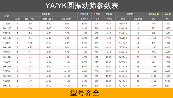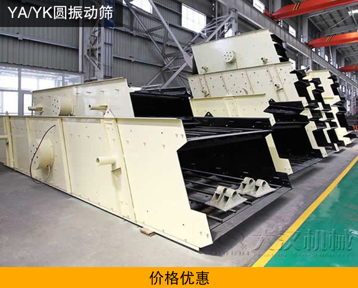型號齊全是由于大漢自生產振動篩以來,已經走過了近三十年,廠房萬余平米,工人上千人,積累了大量的篩分經驗,能夠生產各種各樣型號的YA/YK圓振動篩。