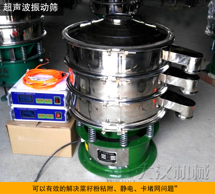 超聲波振動(dòng)篩是將220V,50Hz電能轉(zhuǎn)化為38KHz的高頻電能,輸入超聲波換能器,將其變?yōu)?8KHz機(jī)械振動(dòng),從而達(dá)到高效篩分和情網(wǎng)的目的,非常適合精微細(xì)粉篩分。菜籽粉是一種具有粘附效應(yīng),易產(chǎn)生靜電的物料,而超聲波振動(dòng)篩作為堵網(wǎng)克星,可以輕易的解決粘附、靜電、卡堵網(wǎng)問題。